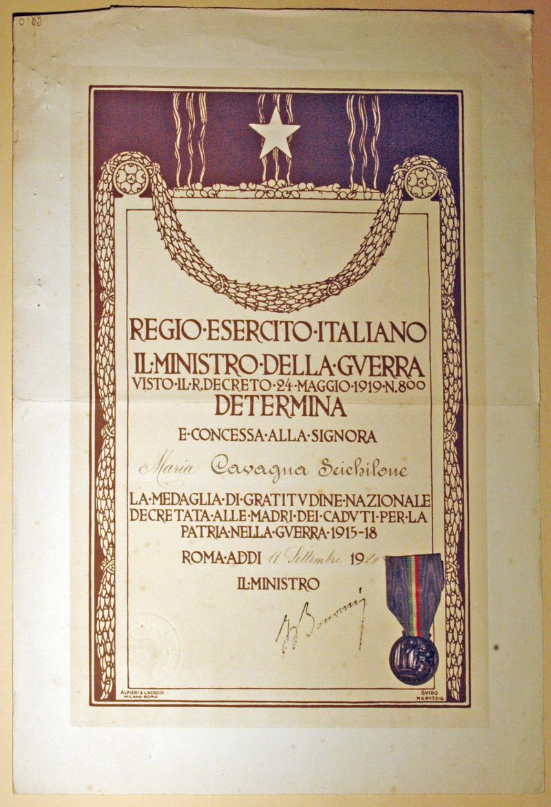 Concesso alla madre di Michele Cavagna, decorato con croce al merito di guerra.
