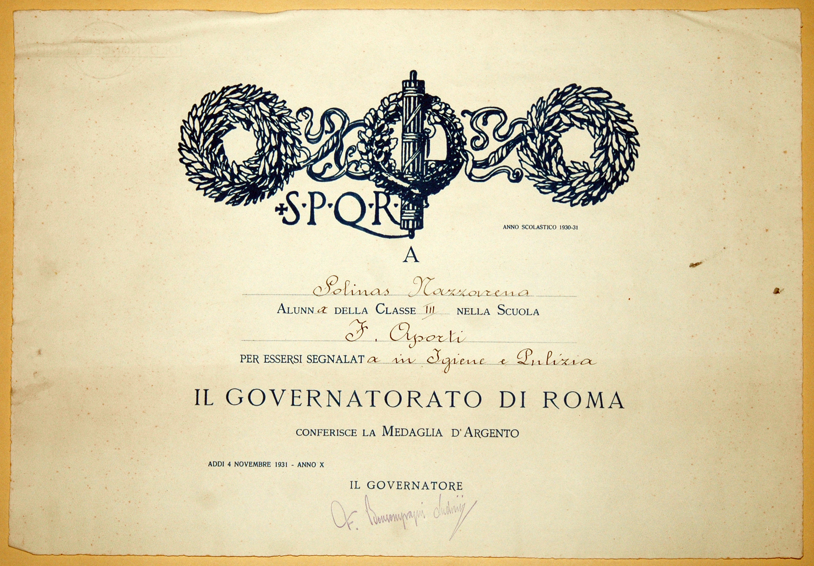 Argento A. X (867) conferito il 4/11/1931 Intestata a: Nazzarena Solinas Collezione: CG |