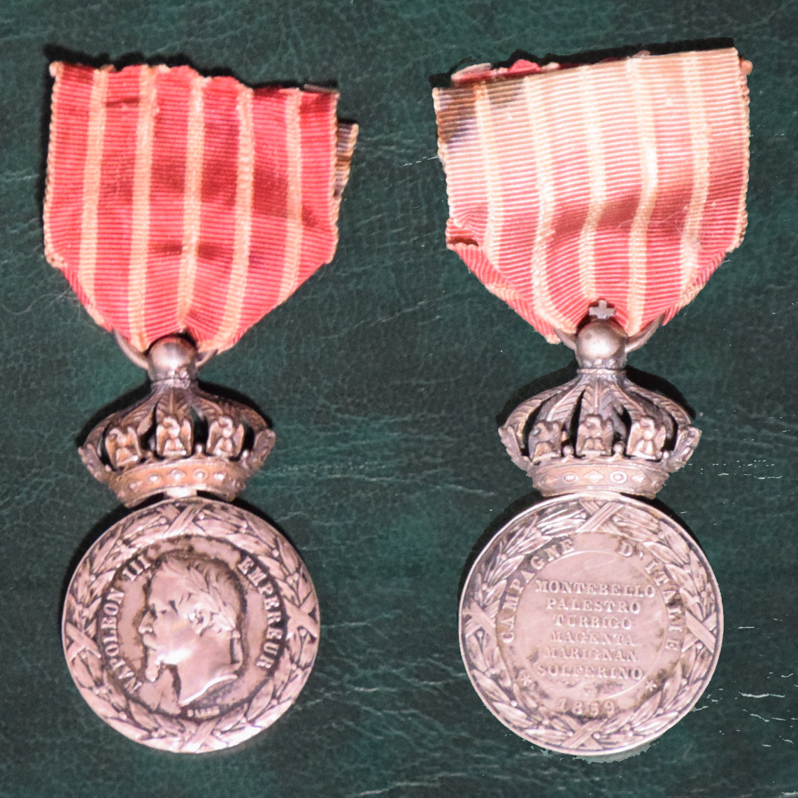 Medaglia commemorativa della campagna d'Italia 1859 (51) Istituita da Napoleone III l'11/8/1859, celebra le battaglie della II Guerra d'indipendenza italiana. Venne concessa anche a soldati dell'esercito Sardo. Esiste in due modelli base, con o senza corona imperiale. Il modello rispondente alle caratteristiche del decreto, con il diametro di 27mm, ora e' detto "di prova". Il modello piu' diffuso, dal diametro di 30mm, e' detto "delle cento guardie" (la scorta personale dell'Imperatore) quando porta la corona imperiale; ne esistono due varianti, diverse per il nome dell'incisore: "E.Falot" e "Falot". Il modello senza corona e' detto "d'ordinanza" ed esiste in 9 varianti, differenziate per il nome dell'incisore e per altri piccoli dettagli: "E.Falot", "Falot", "S.J." (Stefano Johnson), "E.F." (Eugene Farochon), "Sacristain F.", "Ronchi", "C A" e due anonime. Il conio e' dell'Hotel des Monnaies di Parigi (Albert Barre). L'elenco delle battaglie riportato sul verso (Montebello, Palestro, Turbigo, Magenta, Marignan, Solferino) non comprende San Martino, che fu combattuta solo dall'esercito Sardo. In alcuni casi sul bordo e' inciso il nome dell'insignito. ![]() Istituzione : 1859