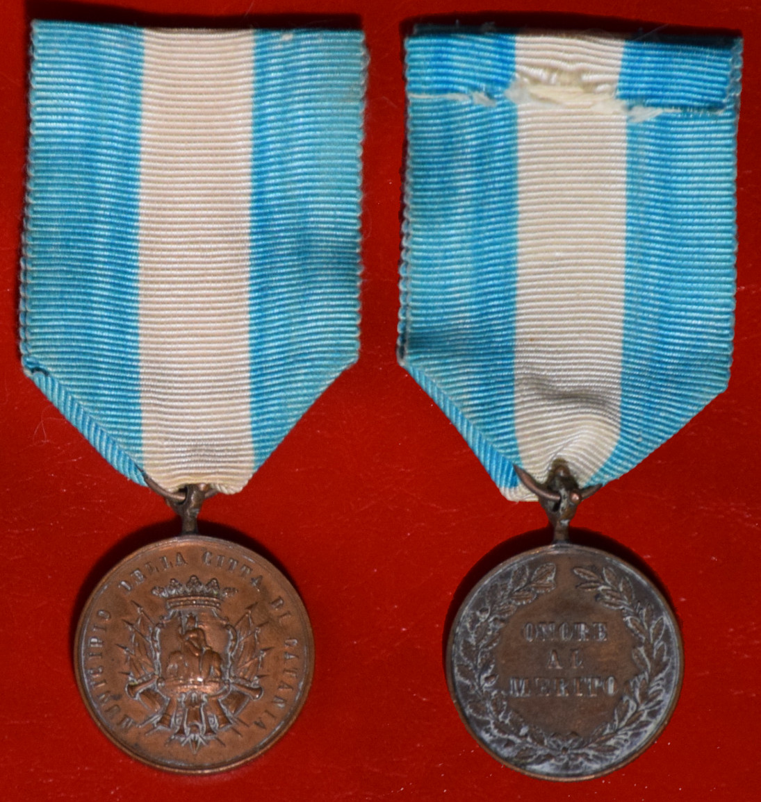 Medaglia municipale Catania - al merito (986) Due varianti, assegnate secondo von Heyden ai cittadini che parteciparono alla sollevazione popolare contro i borbonici. E' possibile che in effetti si tratti di una medaglia generica, usata anche per lo scopo descritto Istituzione : 1860 |